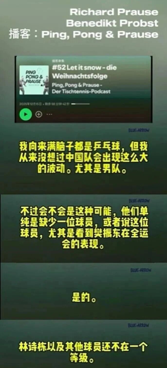 在近日的一场博客节目里,两位德国乒乓球大佬Richard Prause和Benedikt Probst坦率发声,直言中国乒乓球男队已日落西山,林诗栋等小将和樊振东不在一个等级。