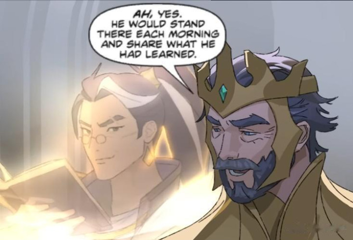 看到嘉文三世因赵信之死面露悲痛,芸阿娜明白了赵信为何如此深爱这个国家。她开始讲述自己在这段时间里对赵信的了解,与国王一同追忆往事。提到赵信非常喜爱在皇家书库阅读,认为其中的记载比艾欧尼亚寺院的古籍更为真实。回忆中的赵信还戴着眼镜——这一形象参考了其“秘密特工”皮肤造型。