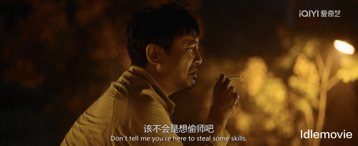 两东谈主坐在石墩上吸烟聊天时,张弛强装不在乎,还故作签订的来了一句“该不会念念偷师吧”来化解狼狈。