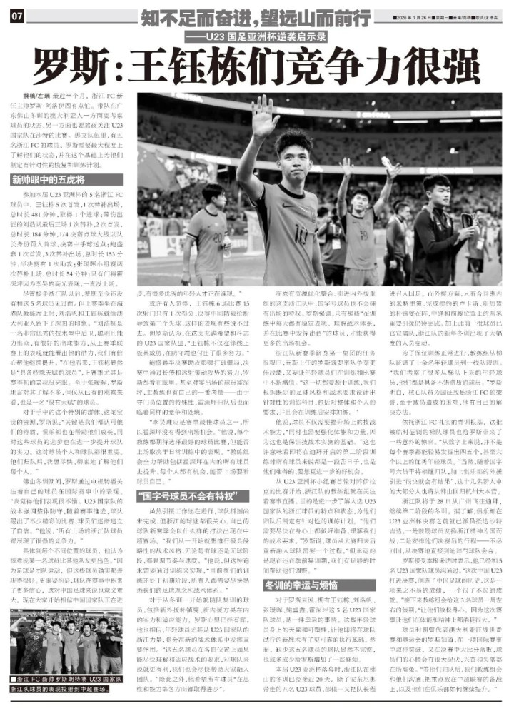 佛山冬训期间,罗斯通过电视转播关注着自己的球员在国际赛事中的表现。“我觉得他们表现很不错。U23国家队的战术强调整体防守,随着赛事推进,球队踢出了不少精彩的比赛,球员们逐渐建立了自信。”他说,“所有上场的浙江队球员都展现了很强的竞争力。”