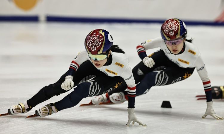 资料图:韩国选手金吉莉(左)、崔敏静在2025-2026赛季短道速滑世界巡回赛暨米兰冬奥会资格赛第三站女子1500米A组决赛中。新华社记者 高静 摄