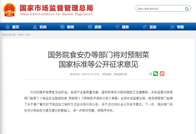 为切实维护消费者合法权益,促进产业高质量发展,国务院食安办组织国家卫生健康委、市场监管总局等部门起草了《食品安全国家标准 预制菜》《预制菜术语和分类》草案;会同市场监管总局、商务部等部门起草了关于推广餐饮环节菜品加工制作方式自主明示的公告,将于近日向社会公开征求意见。下一步,米兰app官网版相关部门将在充分吸纳各方意见建议的基础上,进一步修改完善,按程序发布。