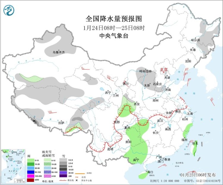 1月24日08时至25日08时,新疆北部和南疆南部山区、西藏、内蒙古河套地区、东北地区东部、青海南部和西部、陕西北部、华北西部等地部分地区有小到中雪或雨夹雪,其中,西藏南部部分地区有大雪(5~9毫米)。陕西南部、湖北西南部、湖南西部、福建东北部、四川盆地西北部、重庆东南部、贵州东部、广西中部、海南岛、台湾岛等地部分地区有小雨,局地有中雨。辽东半岛、宁夏北部、山东半岛等地部分地区有4~6级风,西藏北部、甘肃河西等地部分地区有6~7级风。黄海东部海域、东海东北部海域、台湾海峡、台湾以东洋面、巴士海峡、南海大部海域将有5~7级风、阵风8级。